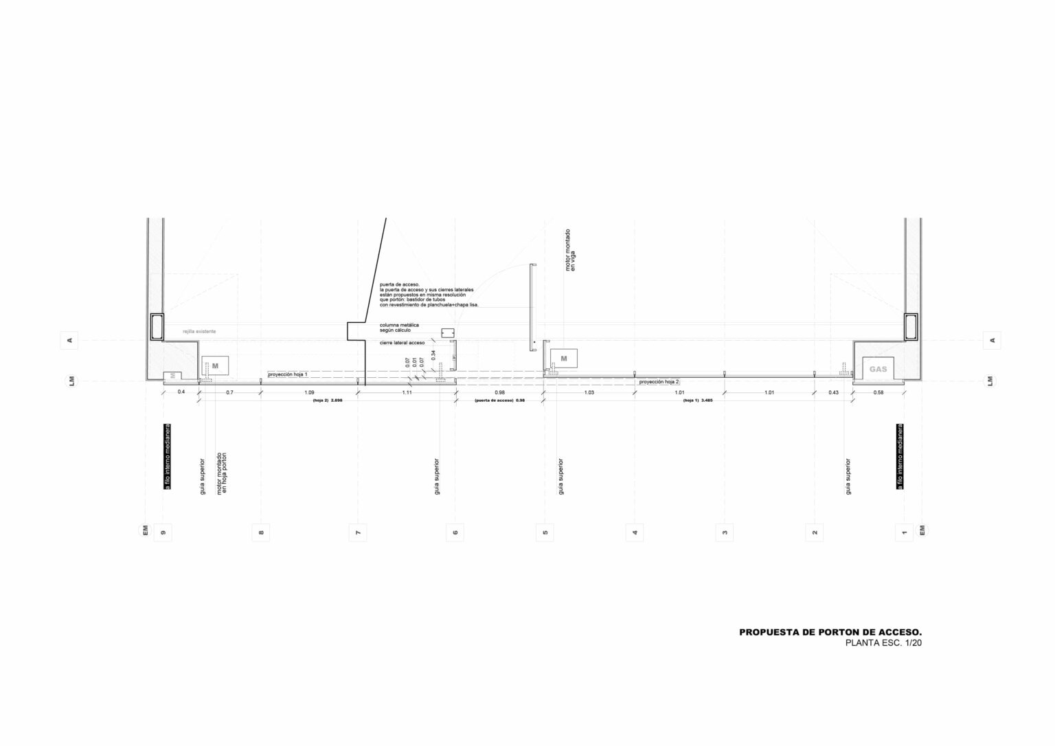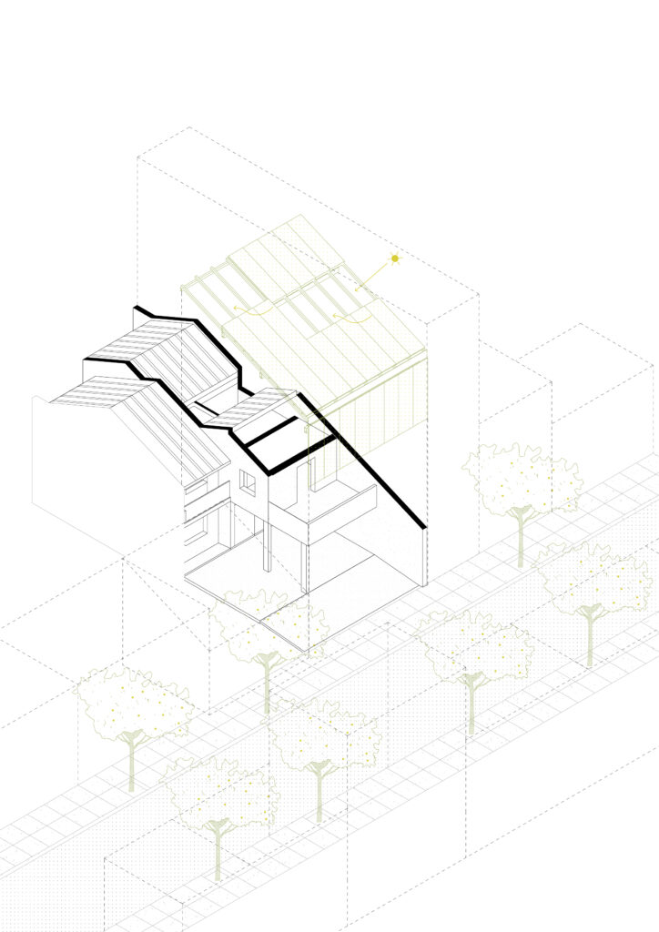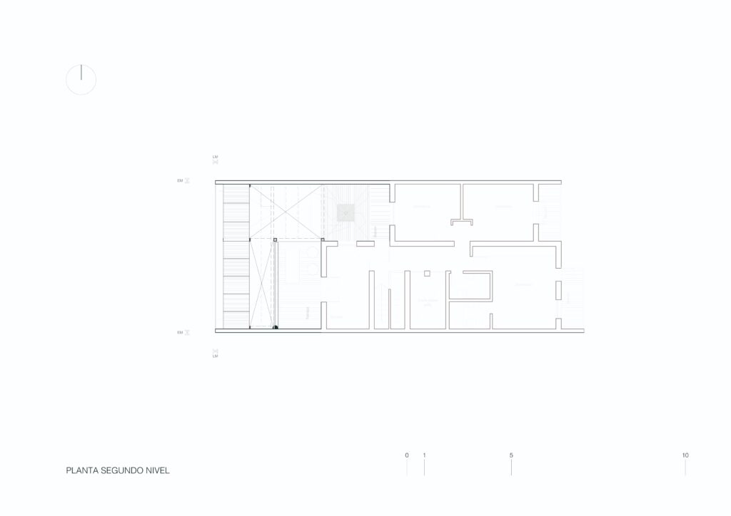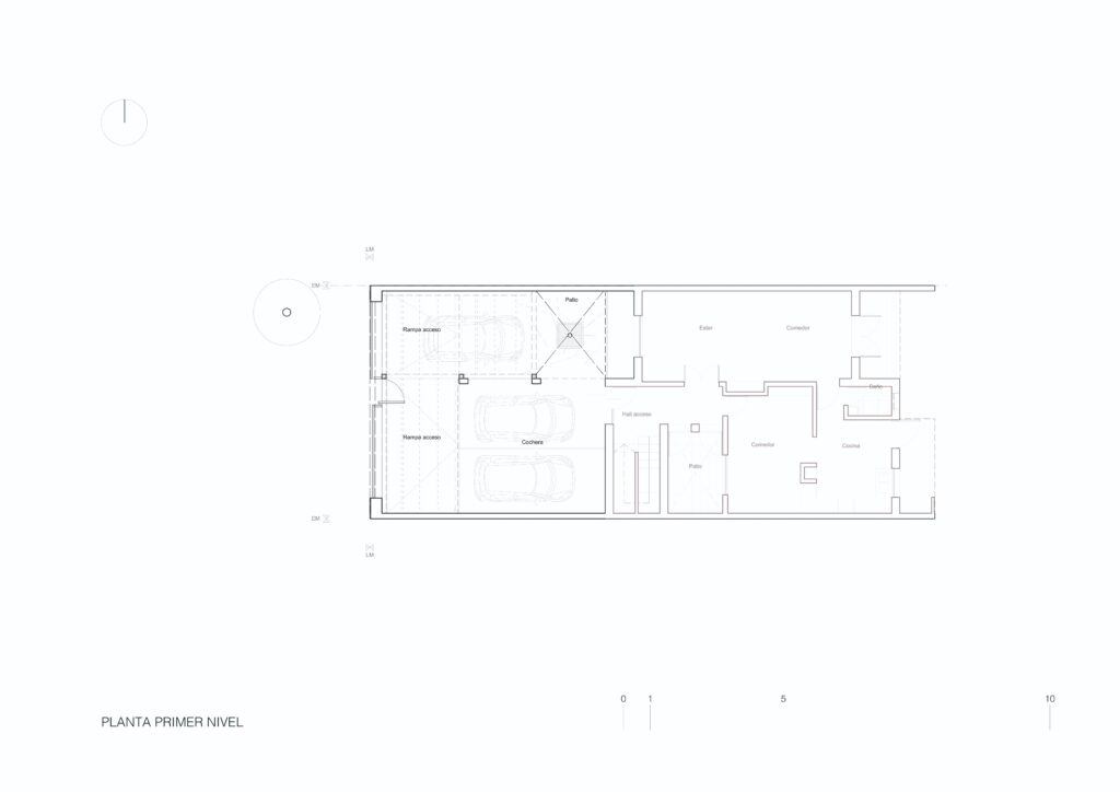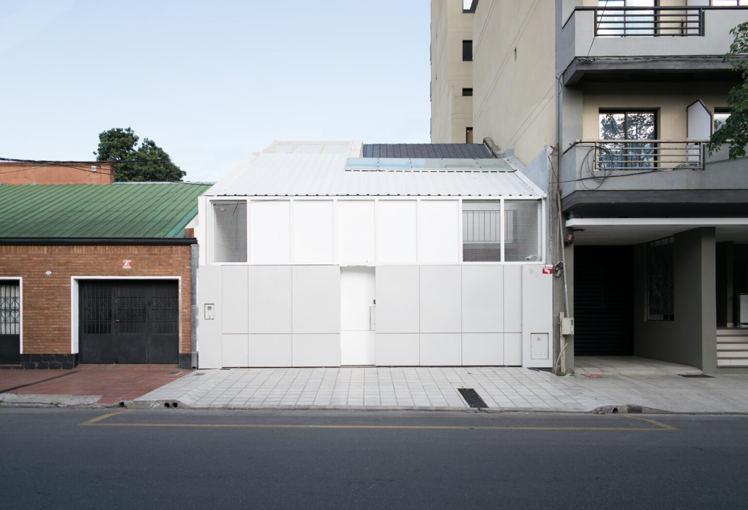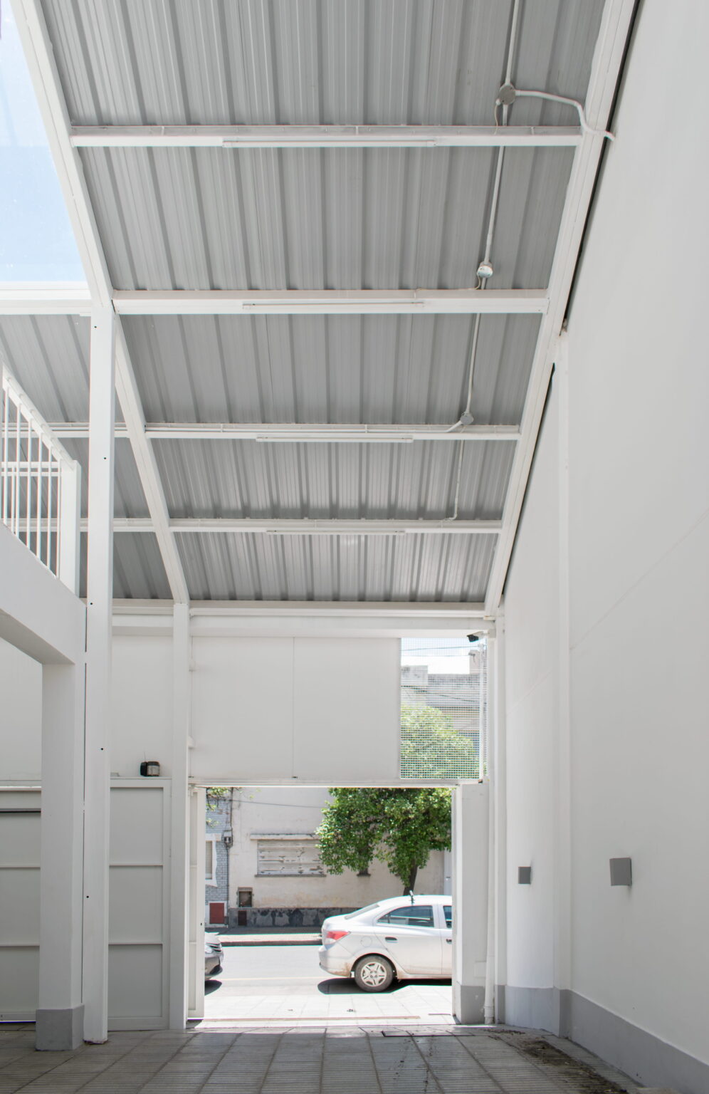 El encargo pedía seguridad y un espacio de cochera para una vivienda urbana entre medianeras. La casa tenía un retiro sobre el que los linderos han avanzado. Todos los espacios comunes que alguna vez ventilaron al espacio urbano estaban contundentemente cerrados y este entraba de manera nociva. Propusimos cubrir el frente con una estructura metálica liviana que resuelve en un gesto cubierta y fachada, que produce un patio-frente techado controlado del clima. Las perforaciones permiten la incorporación de luz en punto estratégicos y su reflexión al interior de la casa.