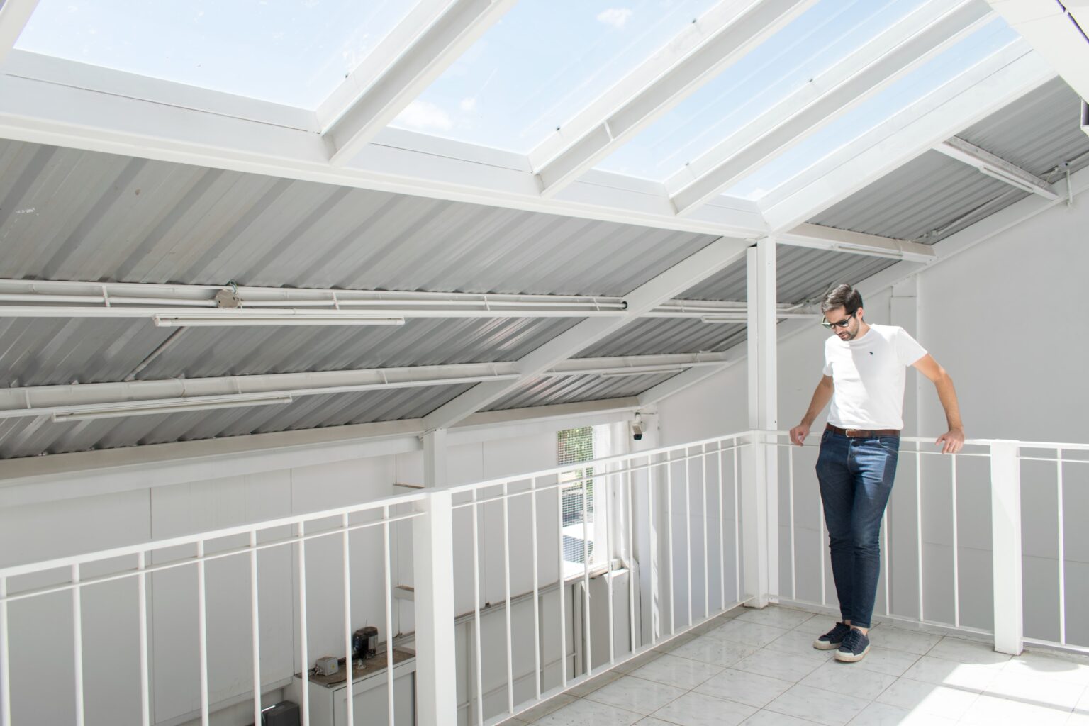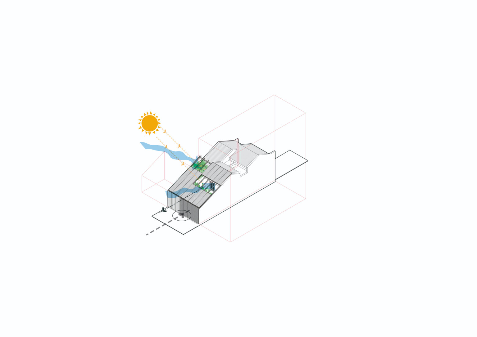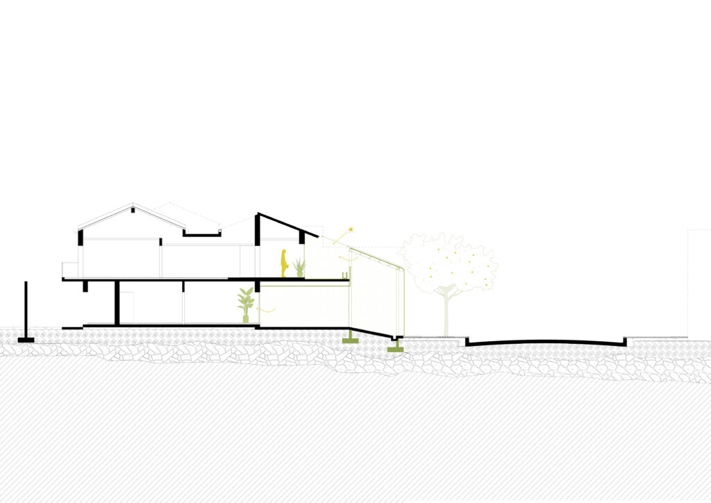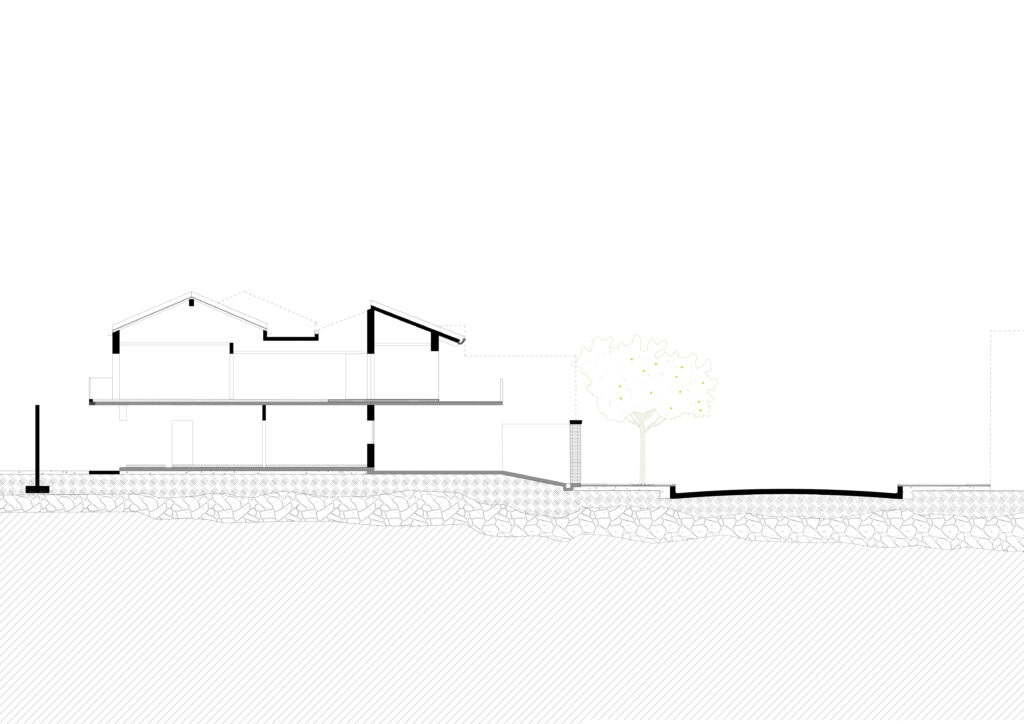 La preexistencia opera a modo de guía: la casa es de mampostería y techos de teja y la intervención es un continuo metálico de un solo gesto.