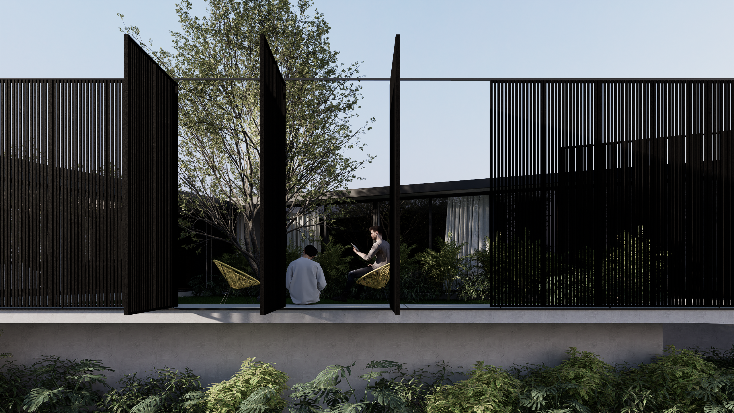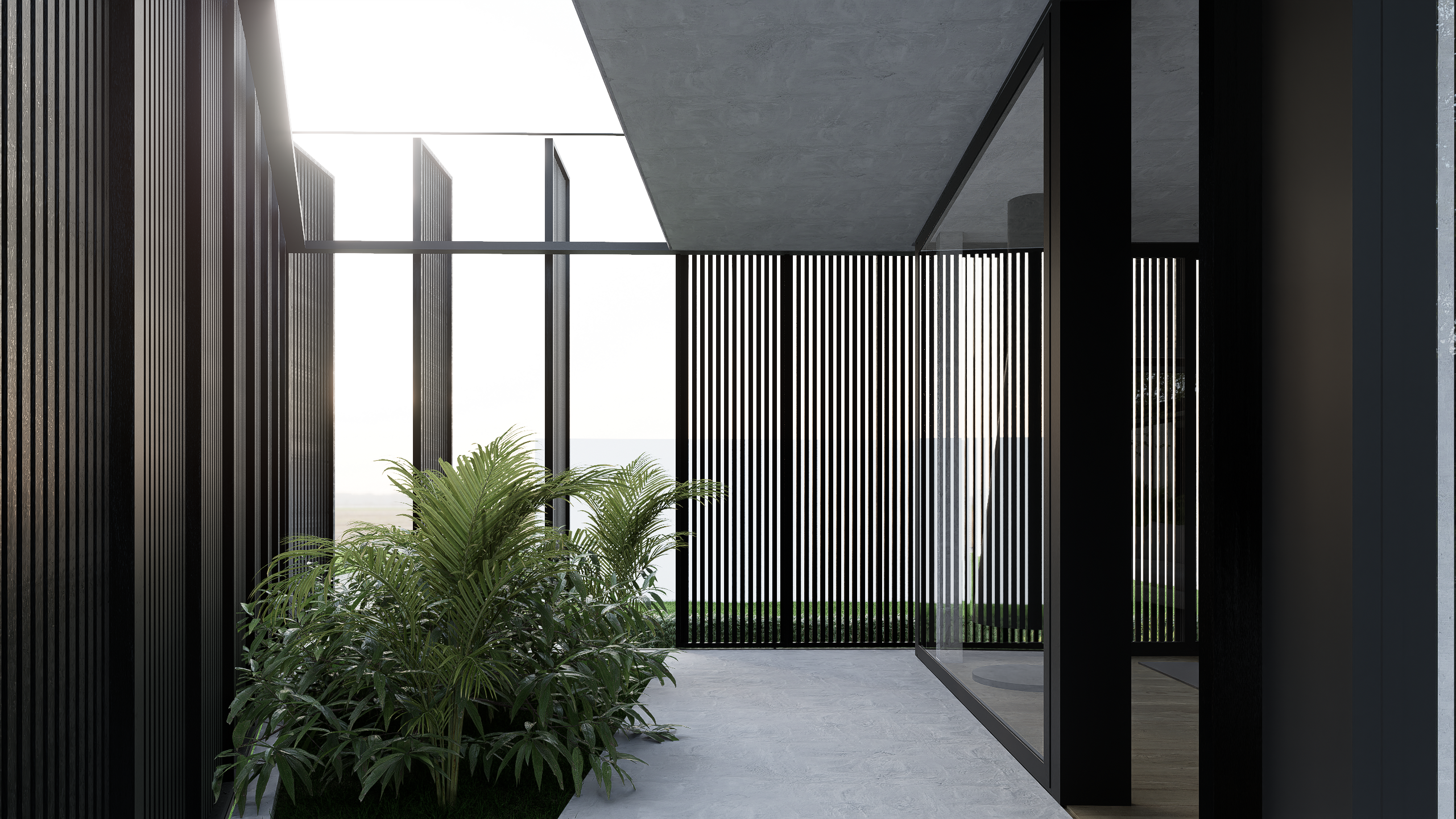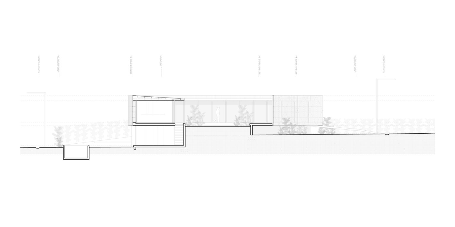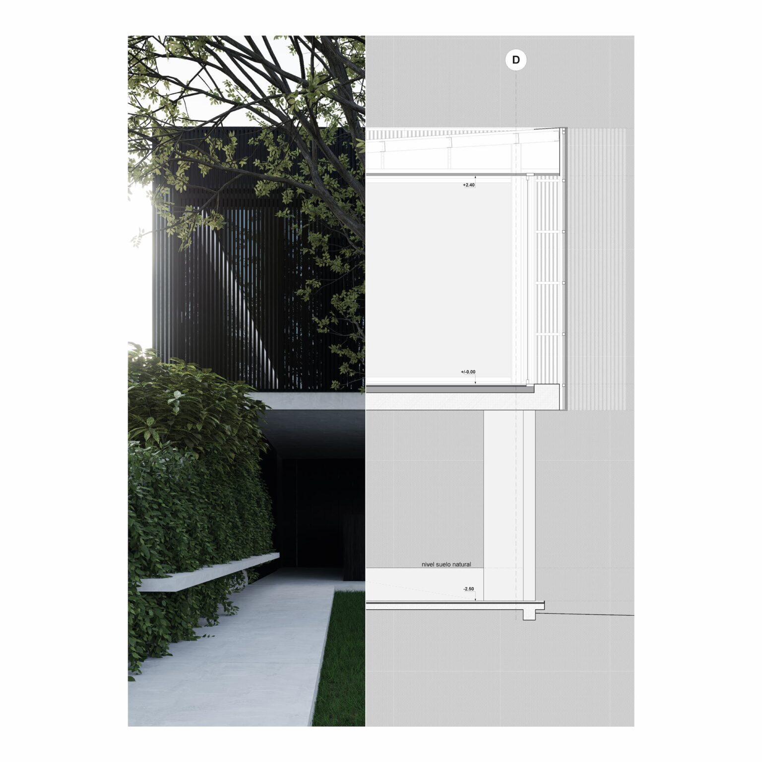 El filtro en su perímetro busca los extremos del área construible normativa, envolviendo la mayor porción de suelo posible, y al mismo tiempo es accionable y permite regular los niveles de permeabilidad y contacto interior – exterior, operando como un elemento que aporta flexibilidad y otorga la capacidad de construir distintas condiciones de uso, en ese gesto de abrazo a los límites contiene en su interior un patio verde, corazón espacial de la vivienda.