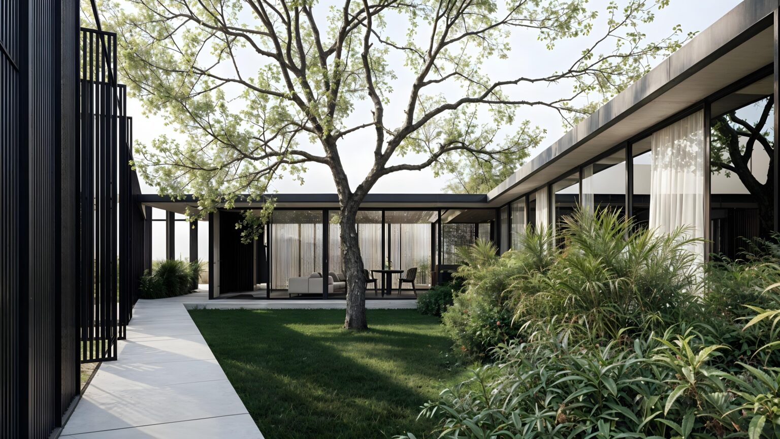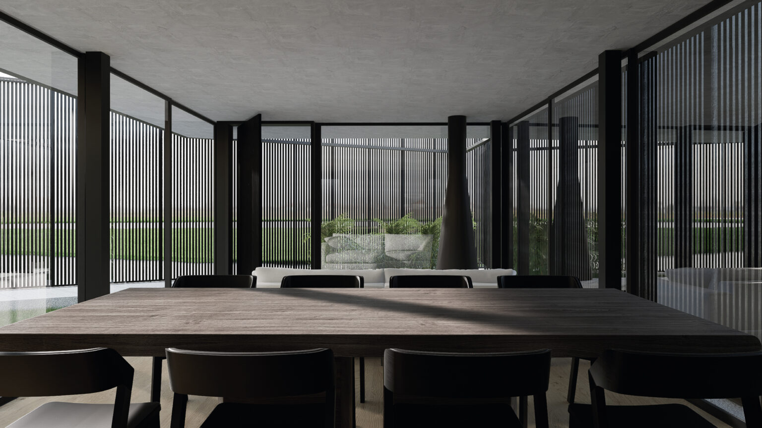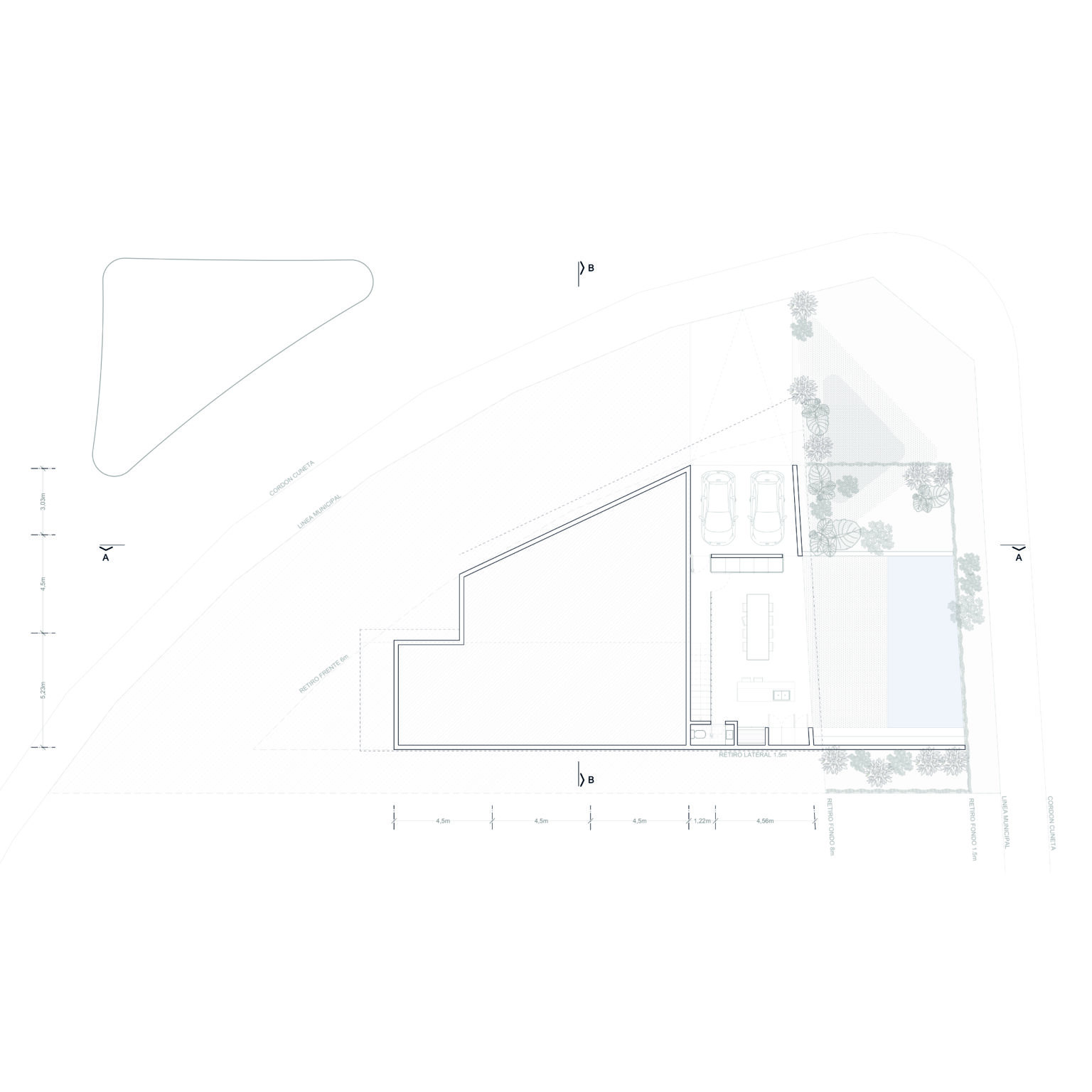 El filtro en su perímetro busca los extremos del área construible normativa, envolviendo la mayor porción de suelo posible, y al mismo tiempo es accionable y permite regular los niveles de permeabilidad y contacto interior – exterior, operando como un elemento que aporta flexibilidad y otorga la capacidad de construir distintas condiciones de uso, en ese gesto de abrazo a los límites contiene en su interior un patio verde, corazón espacial de la vivienda.