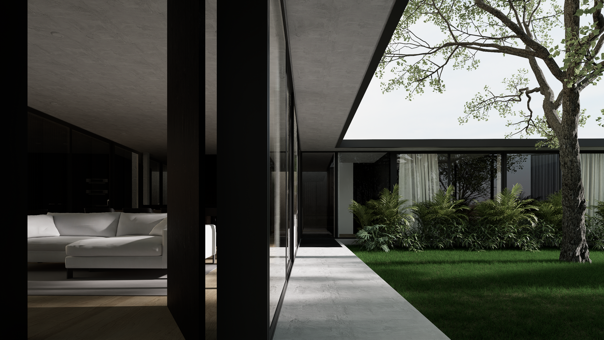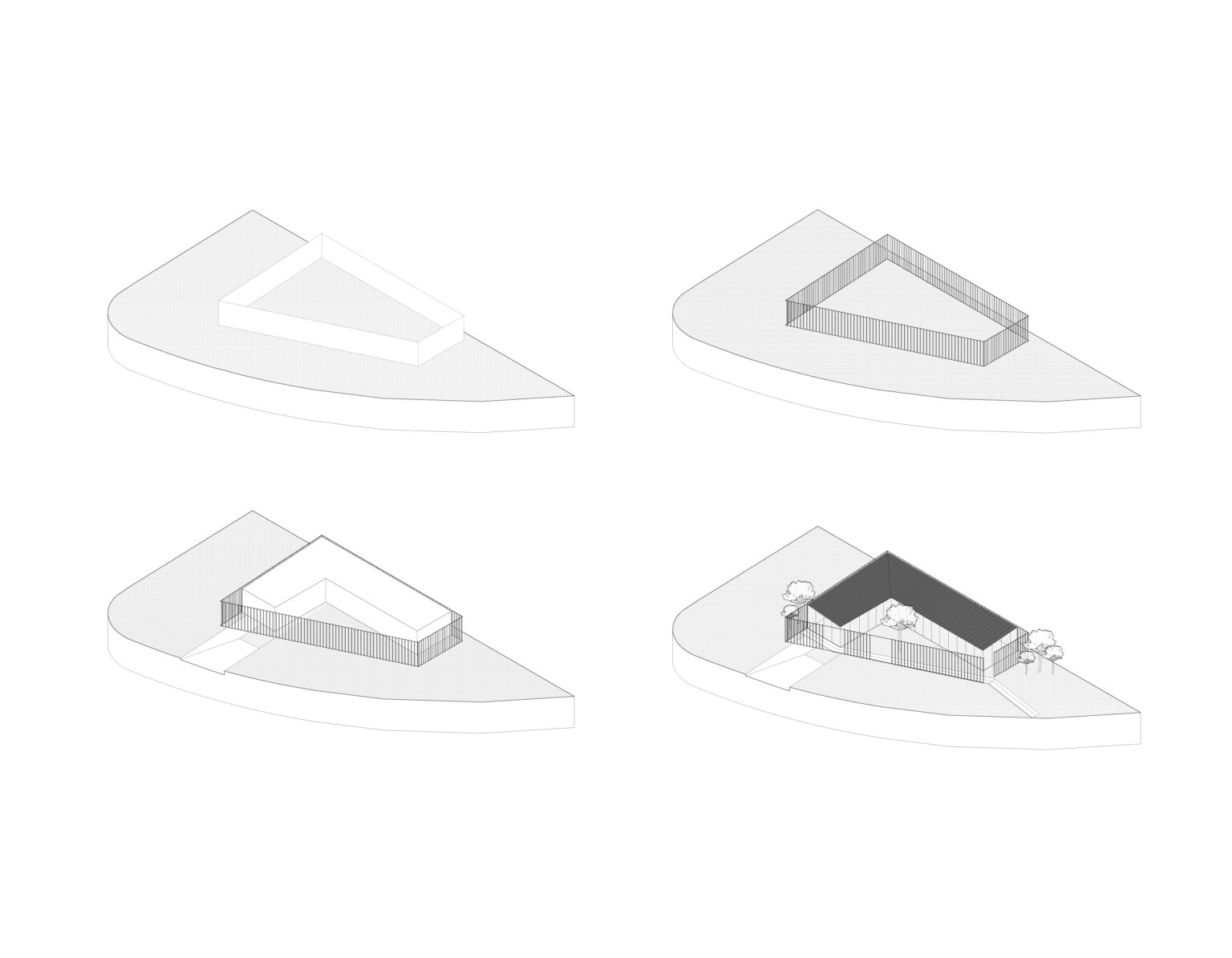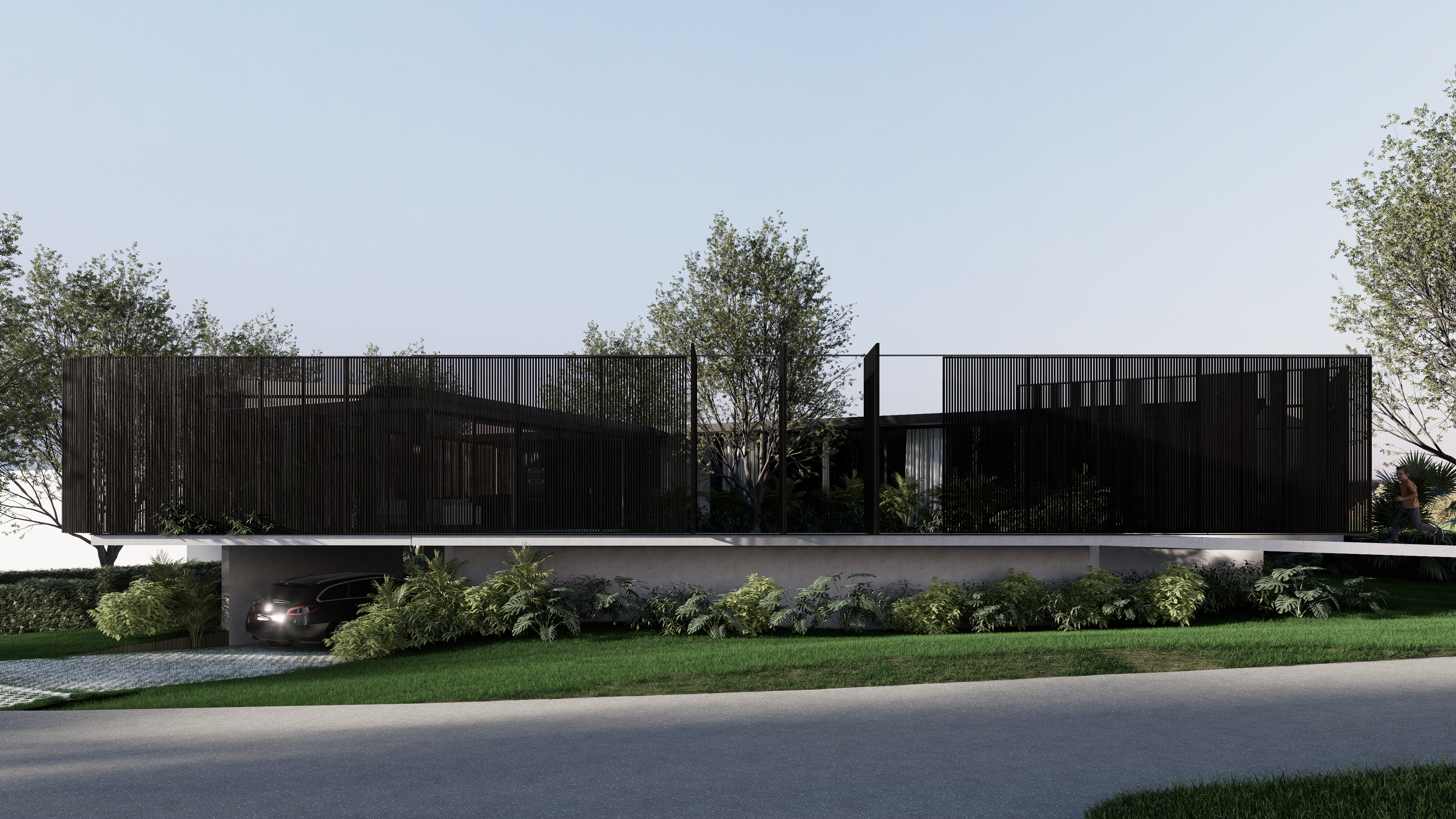 El proyecto toma un juego de doble premisa, atender en simultáneo a variables urbanas, acceso y eje central del country que inciden directamente sobre el terreno a intervenir, una esquina abierta de geometría y normativa particular, y por otro lado a variables domésticas, una vivienda que propone resguardo, transición, contención y calma.