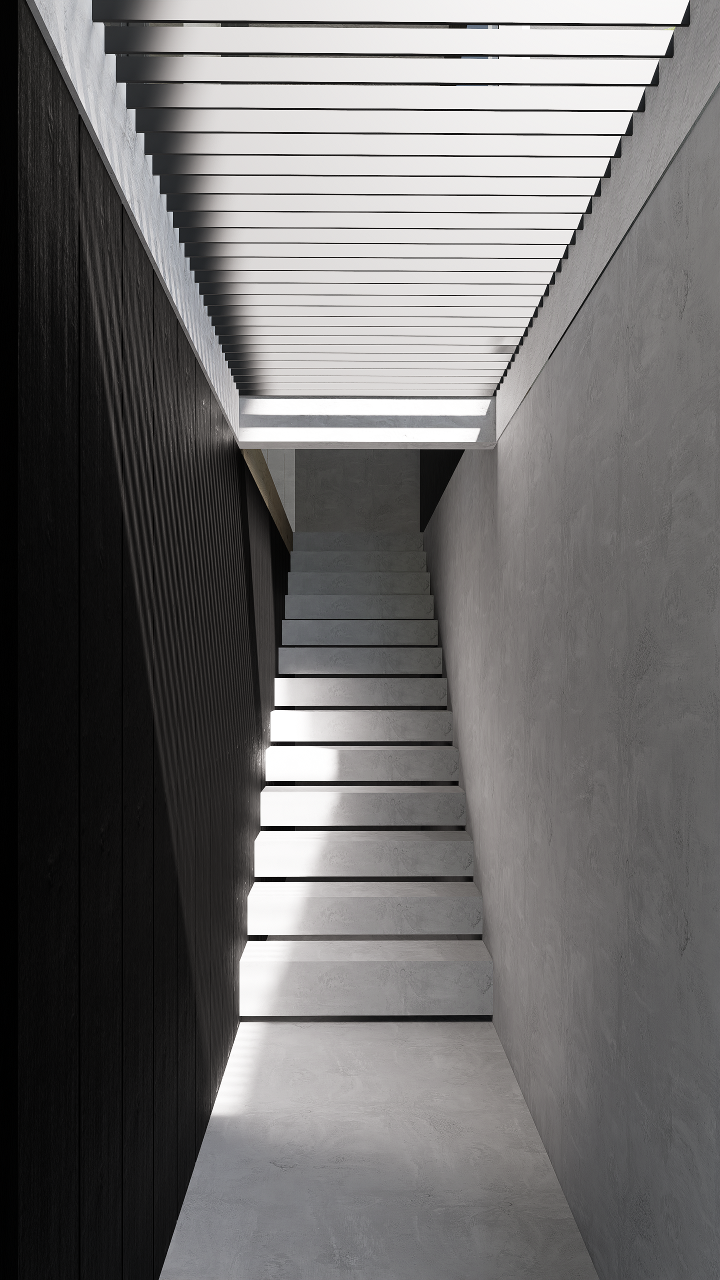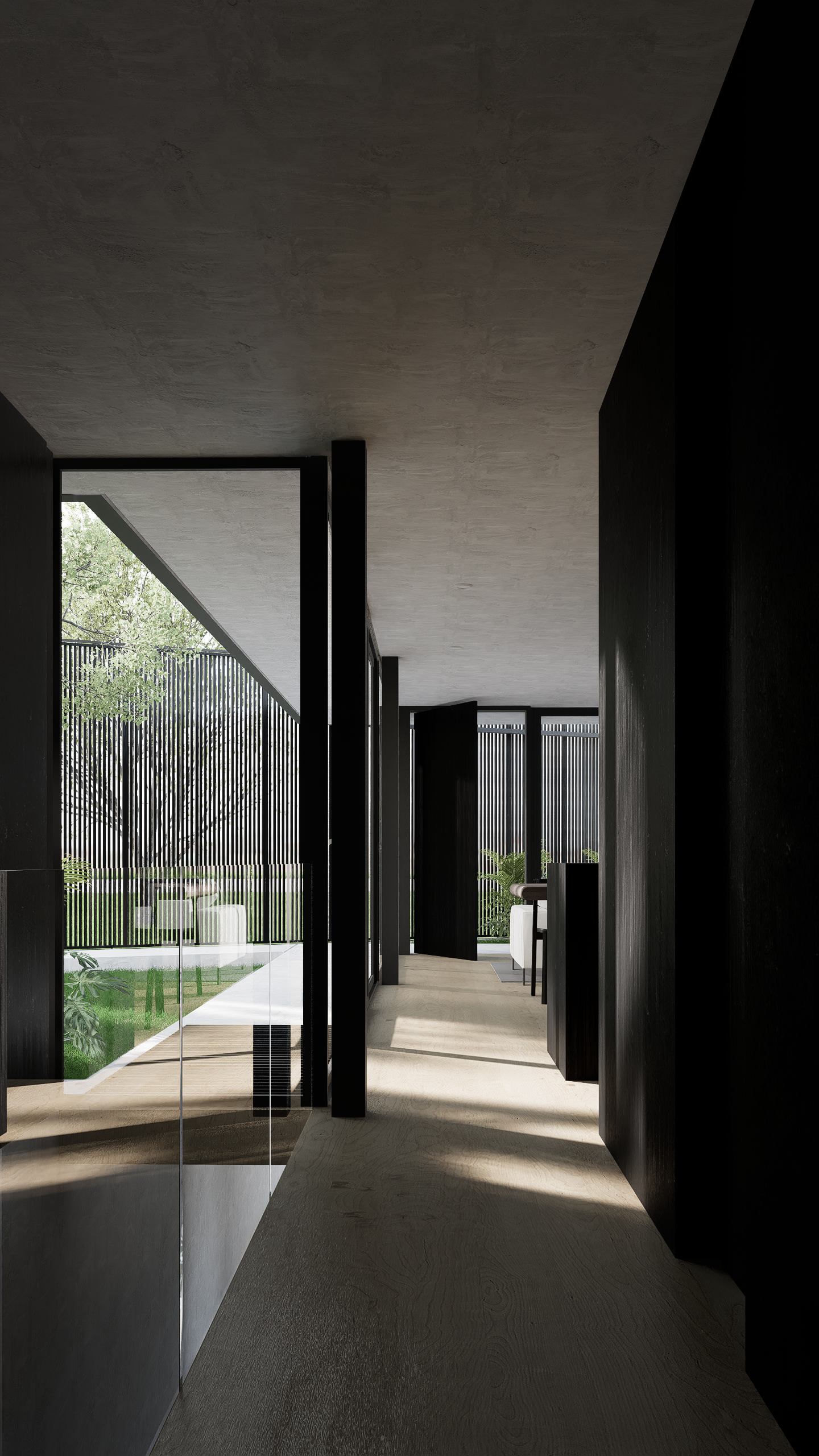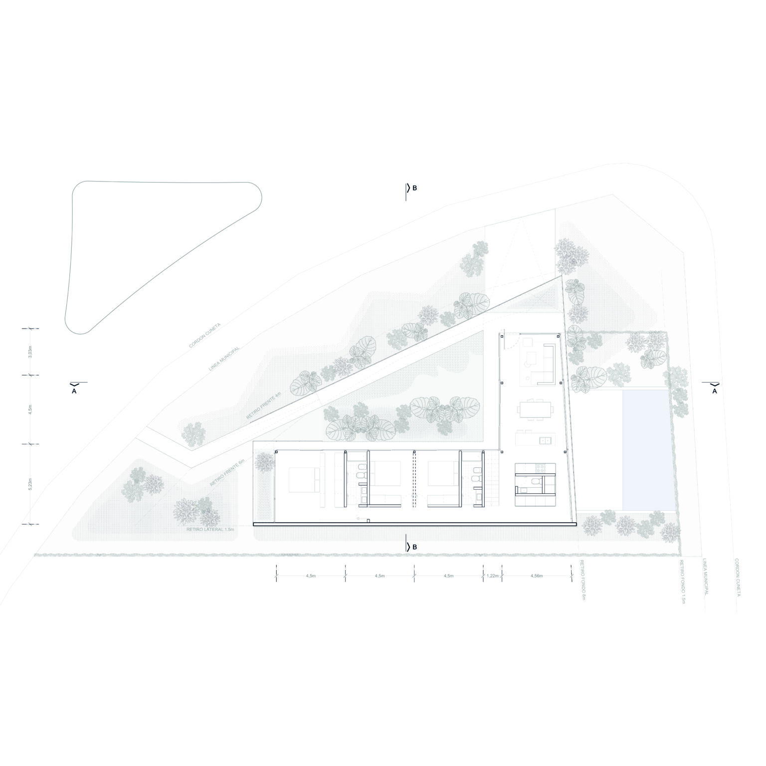 El proyecto toma un juego de doble premisa, atender en simultáneo a variables urbanas, acceso y eje central del country que inciden directamente sobre el terreno a intervenir, una esquina abierta de geometría y normativa particular, y por otro lado a variables domésticas, una vivienda que propone resguardo, transición, contención y calma.