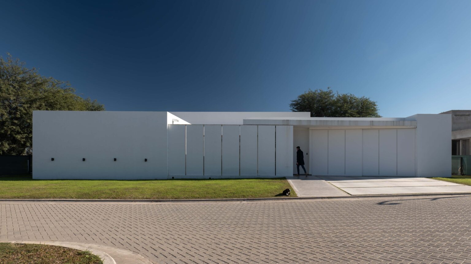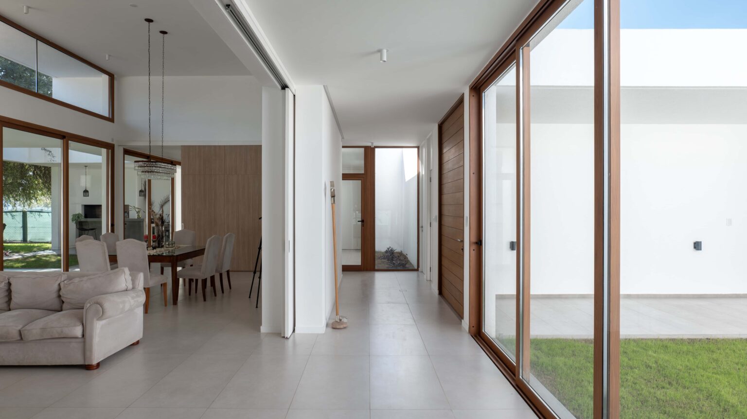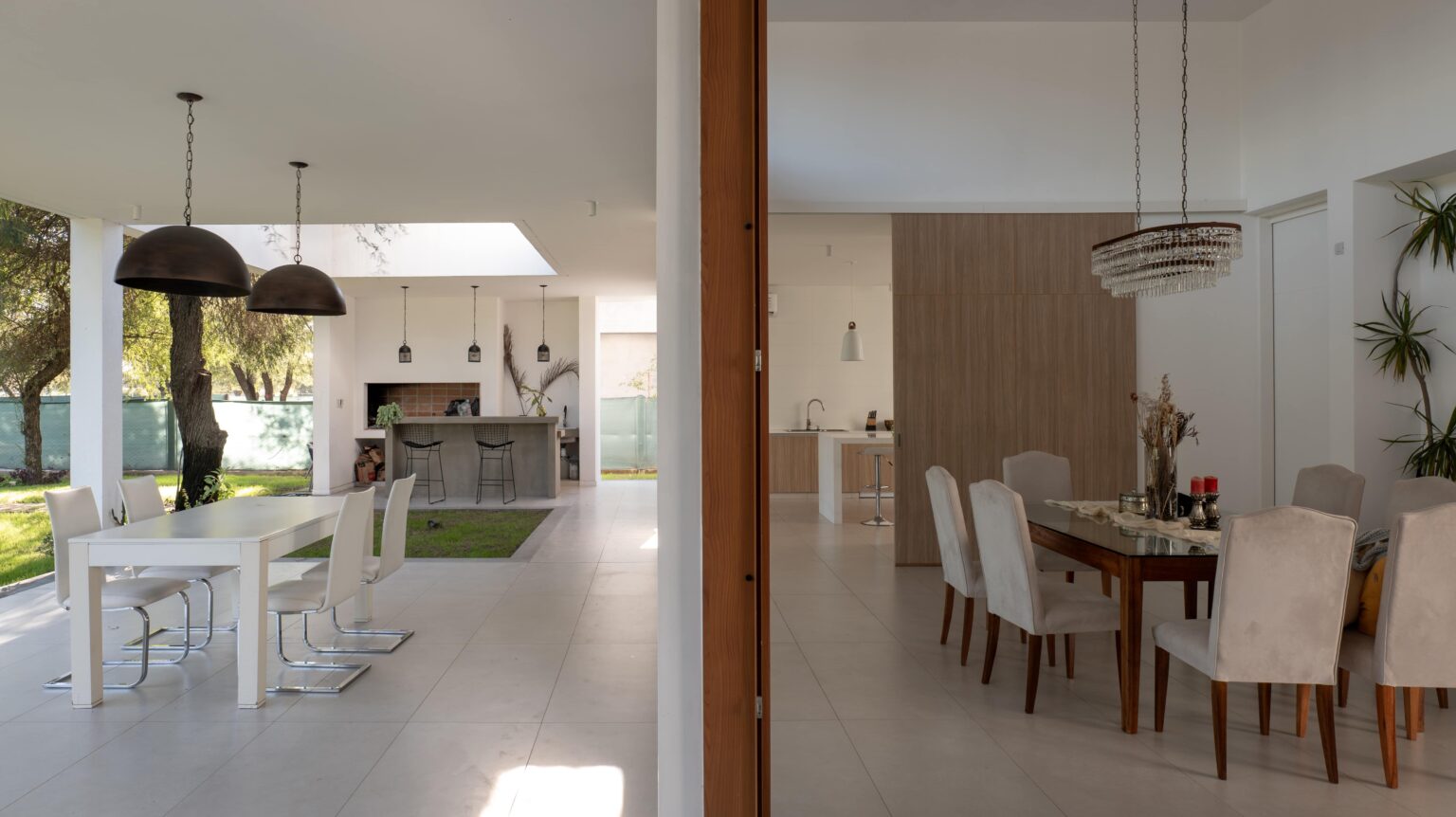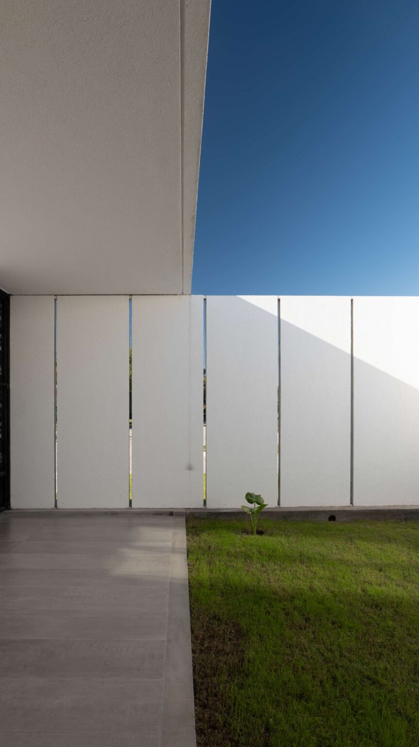 Una materialidad austera, revoques blancos, maderas naturales, solados cementicios continuos y filtros metálicos blancos, generan una atmosfera en donde el acento está puesto en la luz natural, la textura de las sombras y la vegetación.