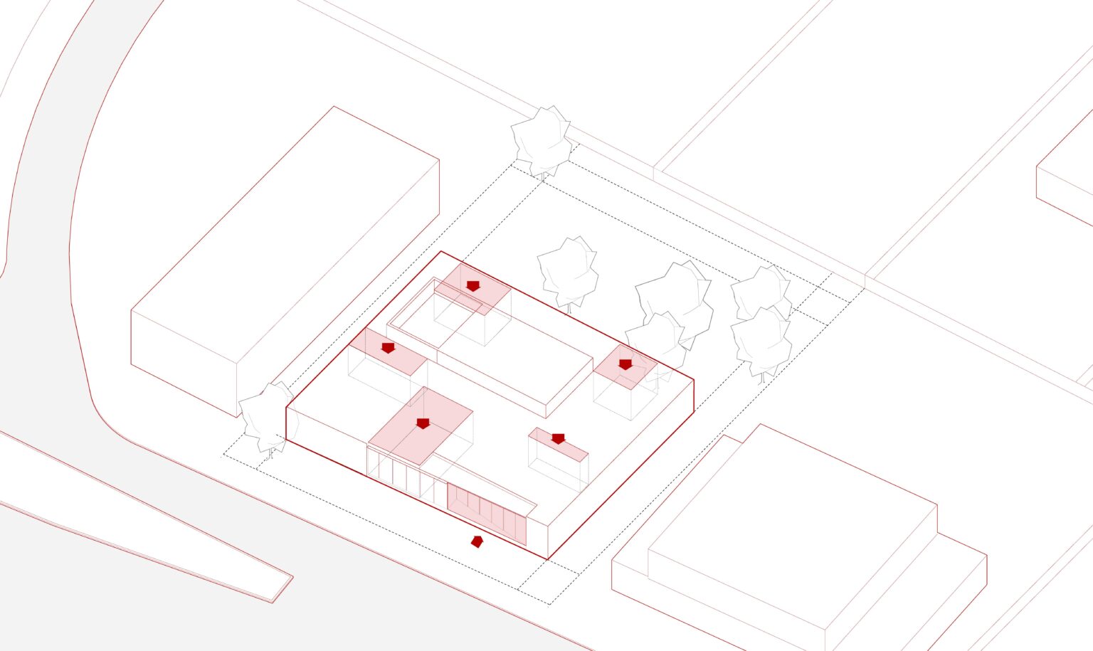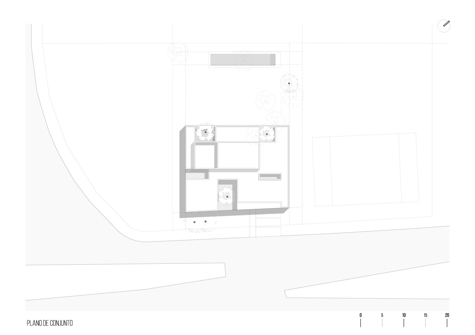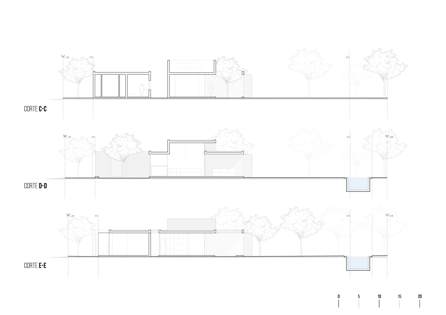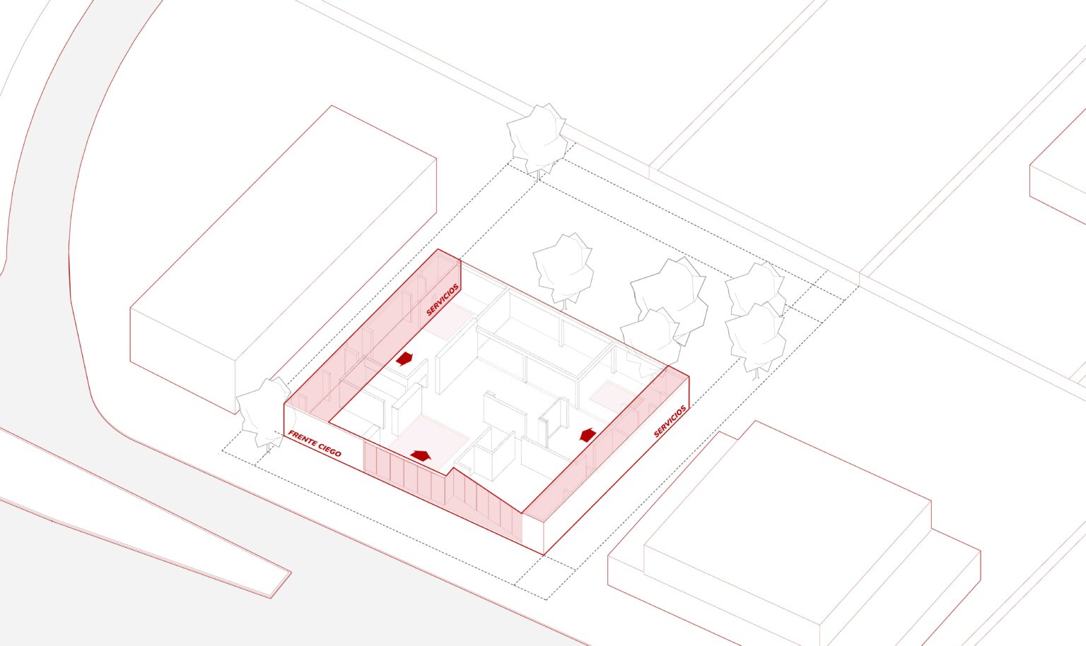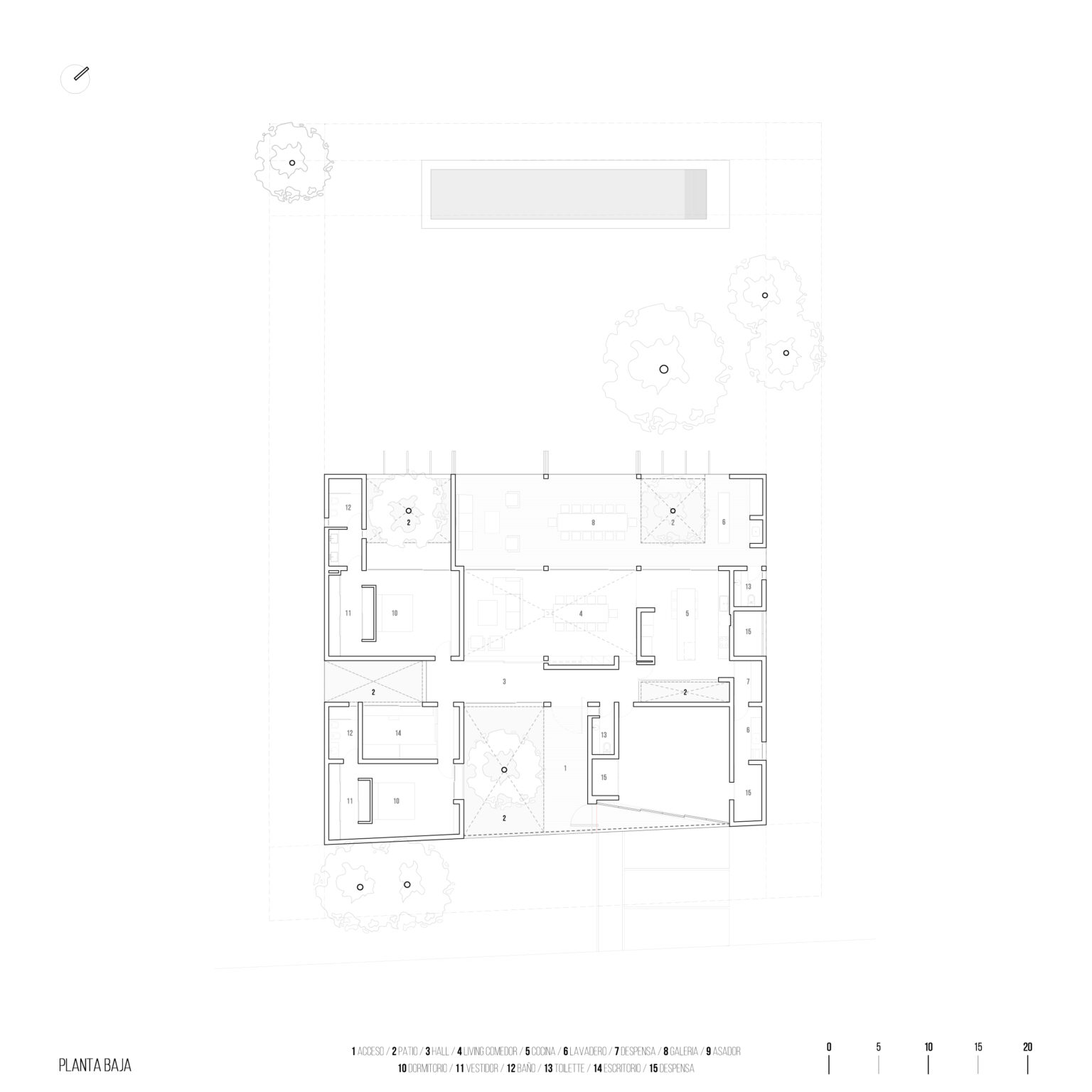 El proyecto nace de los arboles existentes, incorporándolos a cada uno de sus espacios mediante patios, haciéndolos participes de la vivencia interior de la casa. Estos permiten mejorar las condiciones de luz natural, ventilación y contacto con la naturaleza sin comprometer la privacidad.