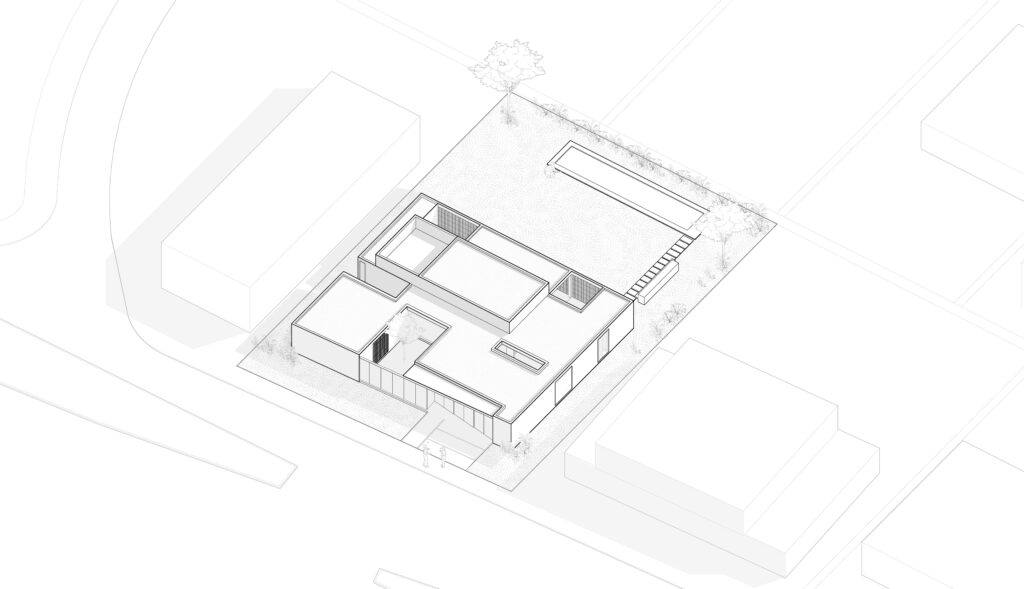 Se plantea una casa que mira hacia adentro y construye su propio microclima de intimidad. Se proyecta una envolvente simple, modulada, la cual genera una situación de introversión.