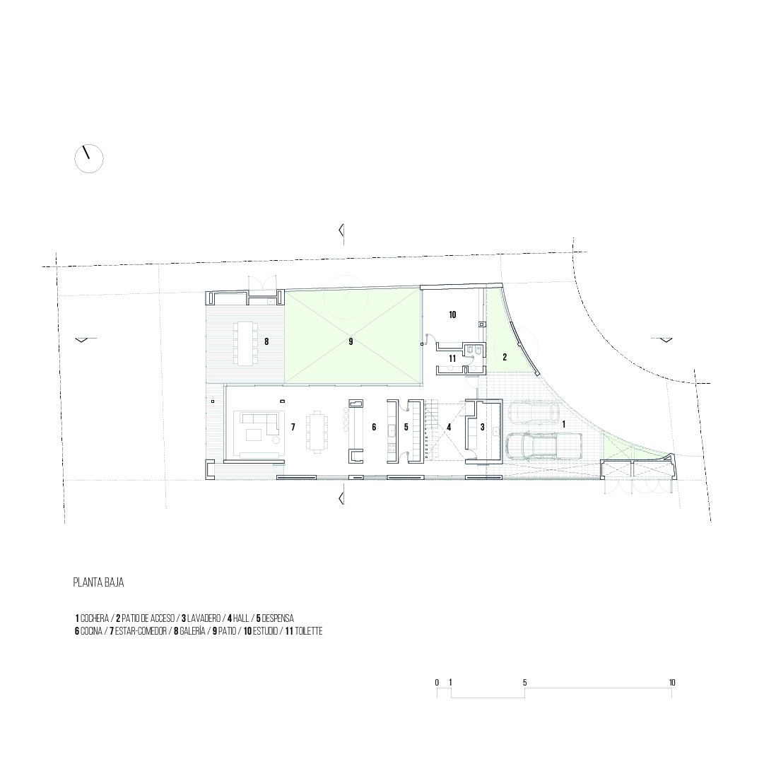 El proyecto cuenta con una estructura modulada y ordenada, para luego liberarse y poder adaptarse a la geometría del lote, generando una curva que permite dar lugar al sistema de accesos y garaje.