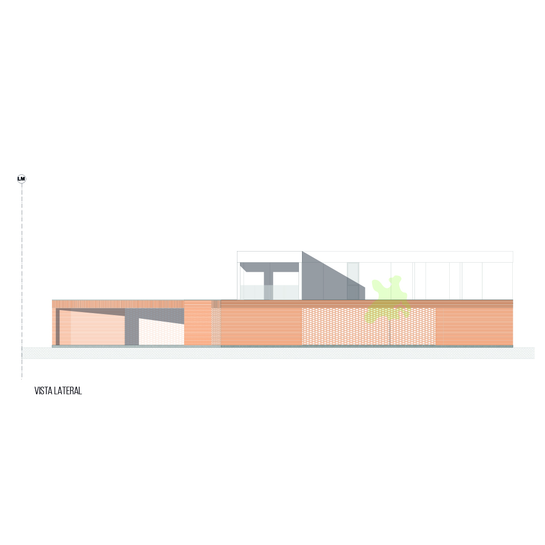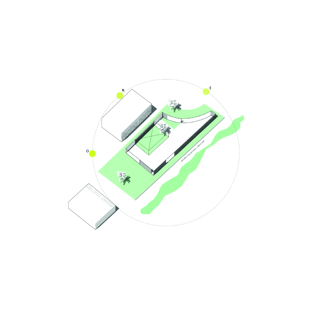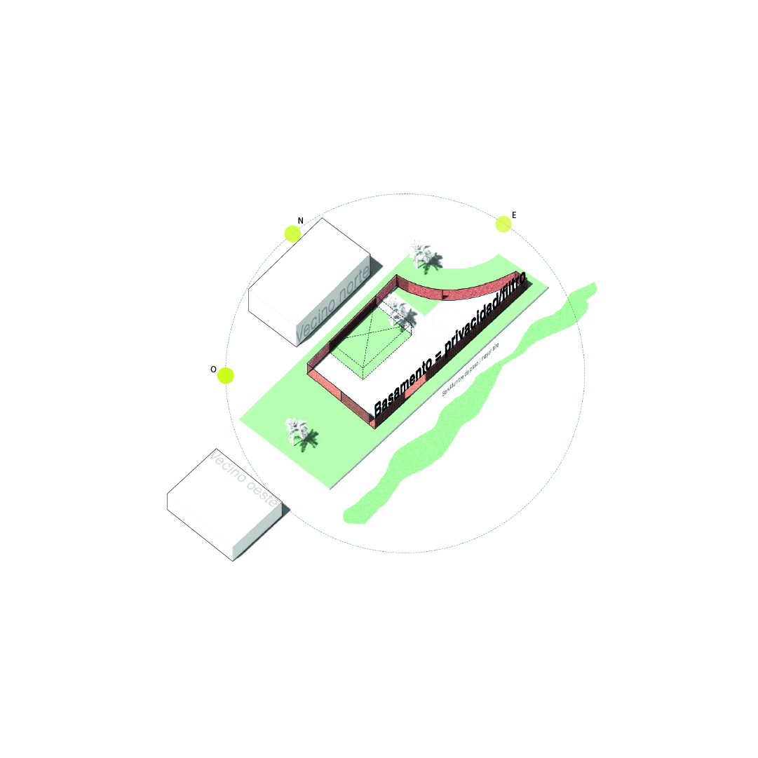 Se plantea una casa que mira hacia adentro y construye su propio microclima de intimidad. Se proyecta a partir de un basamento cerámico cuyo objetivo principal es abrazar y contener la edificación, y que funciona como filtro otorgando privacidad hacia el interior.