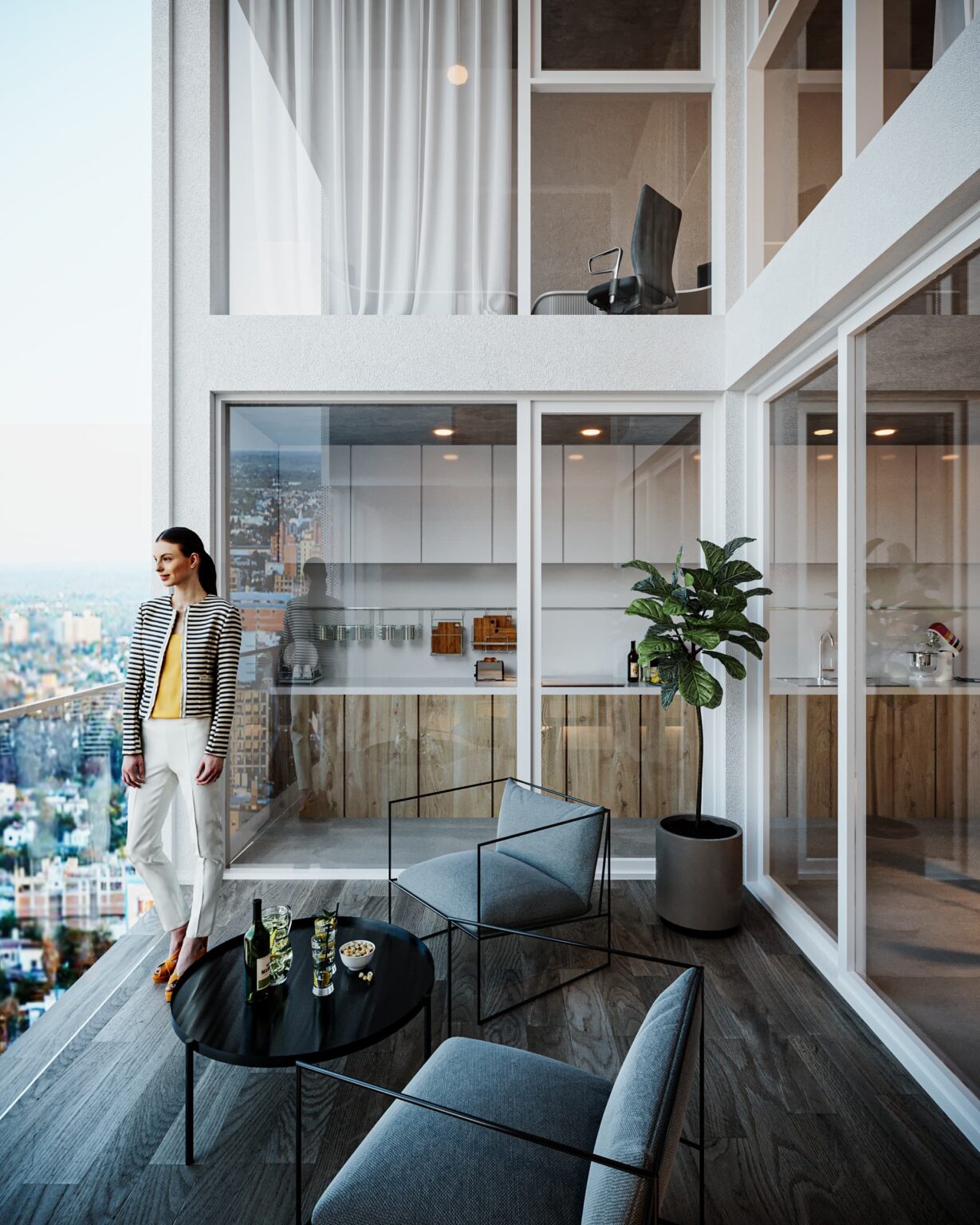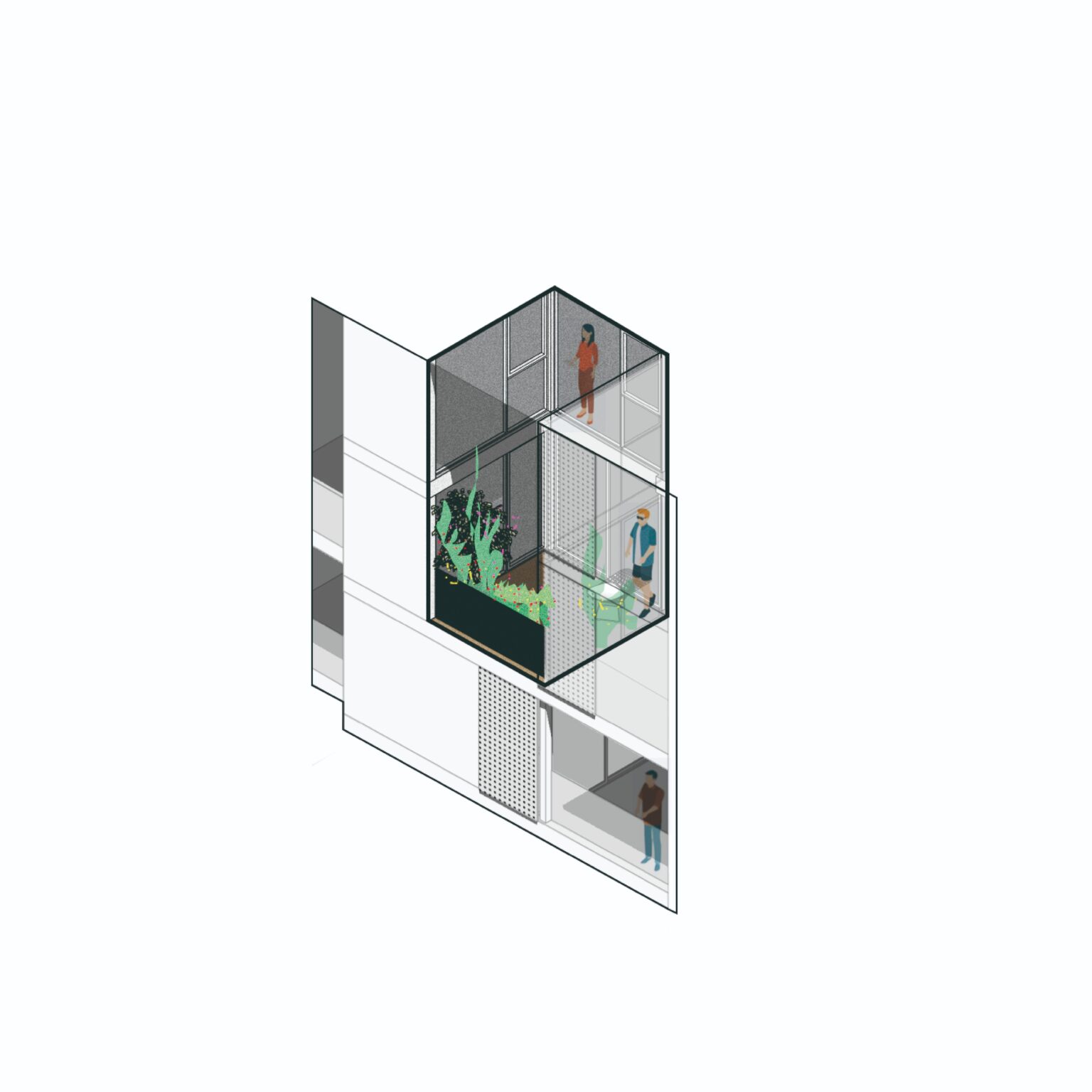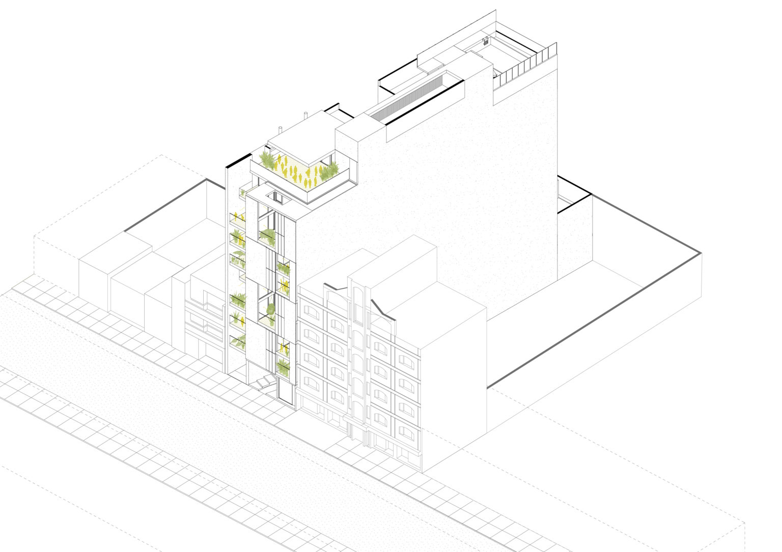 Terrazas Buenos Aires busca llevar la vivencia de una casa al edificio en altura, incorporando terrazas-patio en doble altura, en las unidades dúplex, lo que permiten la conexión espacial de los ambientes en torno a estas y la incorporación de vegetación, generando un clima de casa. Estas terrazas profundas favorecen el control climático ya que las carpinterías se encuentran retiradas de la fachada, en sombra.
