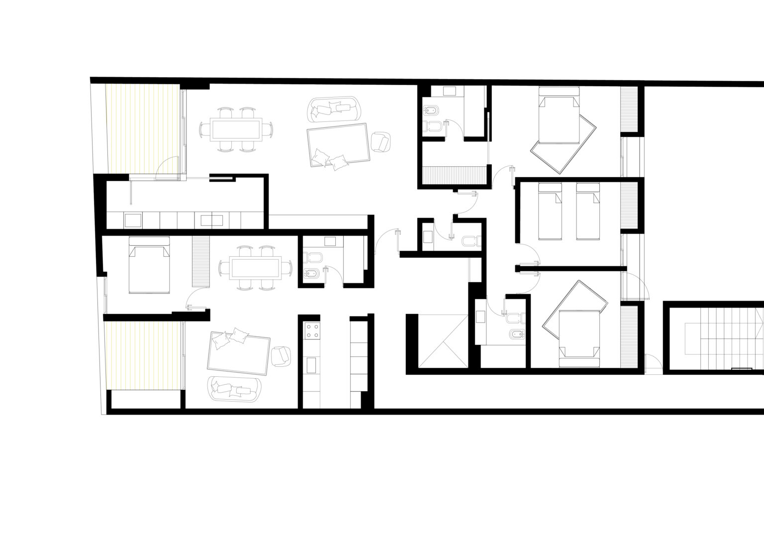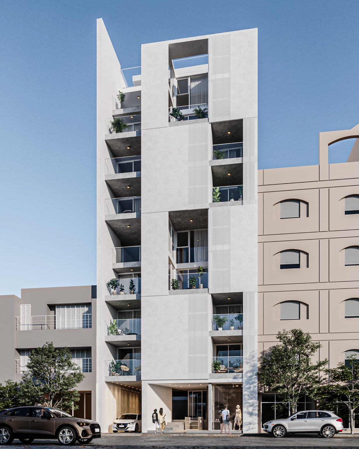 «Al perforar la fachada, a su vez, los vacíos operan a modo de filtro respecto de la relación de la vivienda con la ciudad. Por otra parte, estas terrazas profundas favorecen el control climático en una zona comprometida retirando las carpinterías de la fachada.»