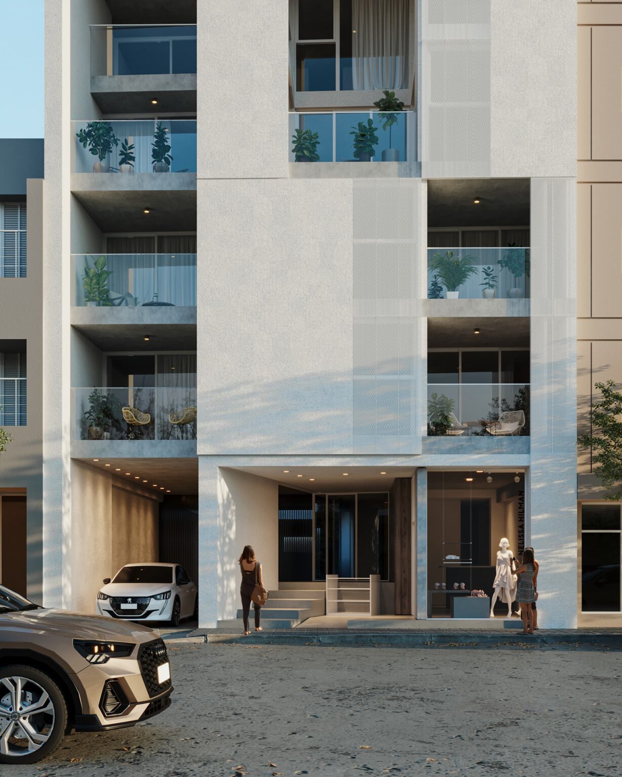 Se busca una conexión al sistema urbano a través de la planta baja. Se genera un espacio de transición, de escala y jerarquía que vincula el espacio público y el espacio privado, en el cual se dispone un local comercial y un amplio sector de cocheras adaptándose a las demandas del sitio.