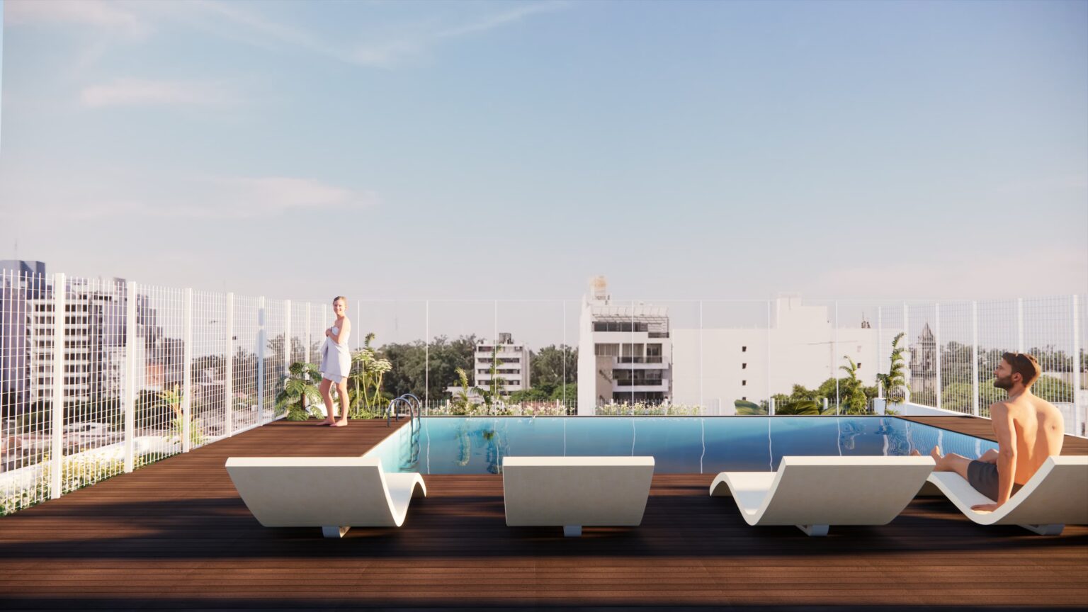 El edificio cuenta con amenities, que sirven como espacios de sociabilización y esparcimiento, un SUM, una terraza, una pileta con solárium y un área de sombra se ubican en el último nivel aprovechando las vistas al Parque Aguirre.